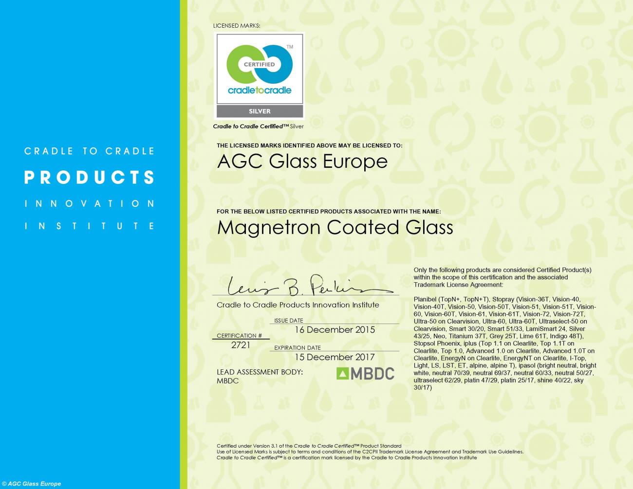Od 2010 r. siedem linii produktów AGC Glass Europe otrzymało certyfikację Cradle to Cradle: szkło float, szkło z powłoką magnetronową, błyszczące szkło lakierowane, matowe szkło lakierowane, szkło trawione kwasem, lustra i szkło laminowane. Niedawno certyfikacje zostały przedłużone na dwa lata dla nowej, surowszej wersji 3.1 programu Cradle to Cradle.