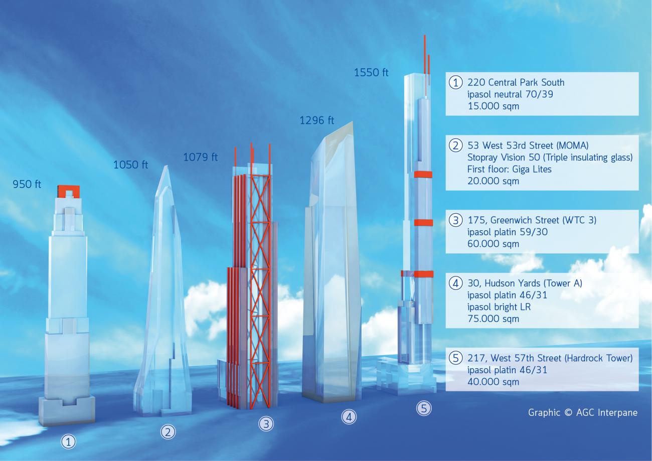 17 gratte-ciel new-yorkais sont actuellement en cours de construction avec des vitrages à protection solaire fournis par AGC Interpane. Ces différents projets se sont fait remarquer au niveau international. Ils concernent notamment le World Trade Center, le complexe immobilier de Hudson Yards, le Museum of Modern Art et la Hard Rock Tower, pour n’en citer que quelques-uns. En mars 2016, 29 projets étaient en cours de réalisation aux États-Unis, et ce chiffre devrait très certainement augmenter. Les architectes en charge de ces projets sont Kohn Pedersen Fox, Adrian Smith + Gordon Gill Architecture, Richard Meier & Partners Architects, Rogers Stirk Harbour + Partners, Foster & Partners et plusieurs autres bureaux d’architectes de premier plan. Le carnet de commandes international de la société est donc bien rempli !