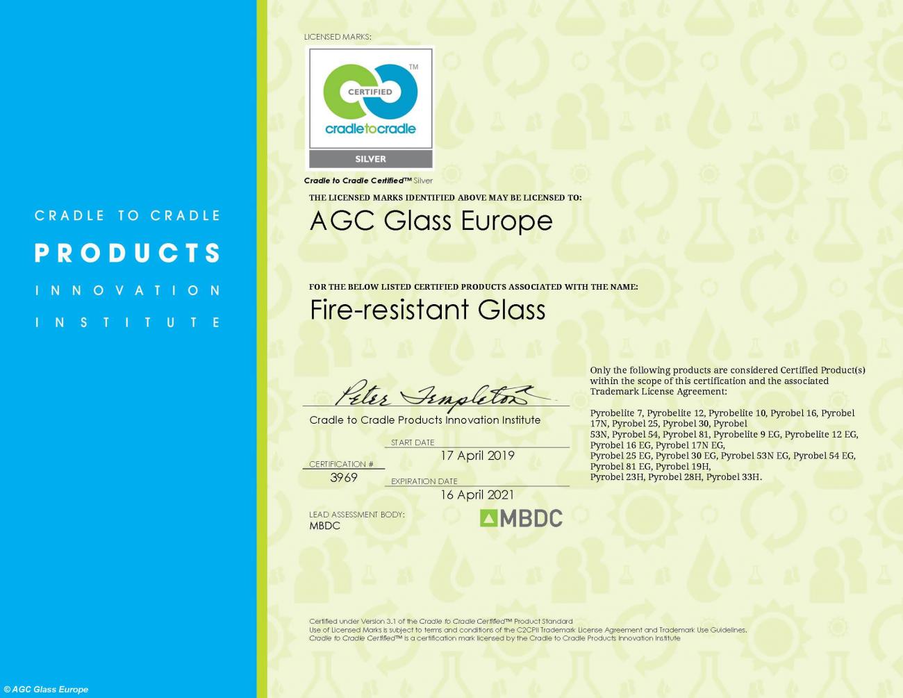 Door toekenning van het Cradle-to-Cradle Zilver-certificaat voor brandwerende glasproducten blijft AGC haar streven naar duurzame glasproducten waarmaken. Het algemene certificeringsniveau voor de Pyrobel- en Pyrobelite-reeks is Zilver, terwijl voor vier van de vijf categorieën het niveau Goud wordt behaald: Hergebruik van materialen, duurzaam waterbeheer, hernieuwbare energie en CO2-beheer, en sociale billijkheid.